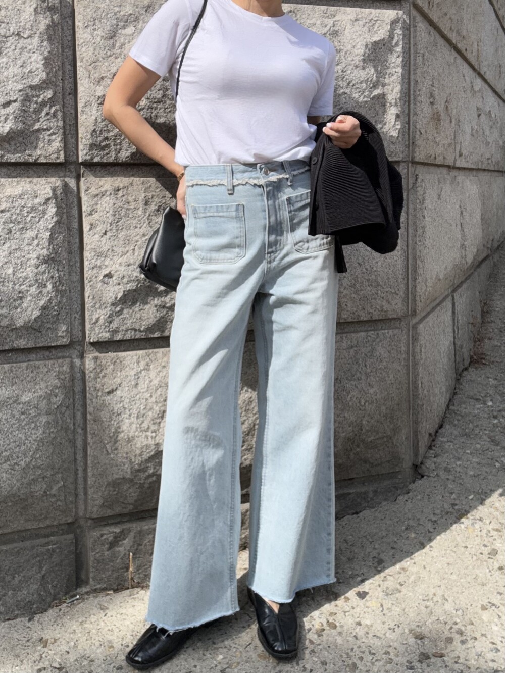 거기에 맞추어 바지 밑단도 내추럴하게 풀어 마감되어 있어요